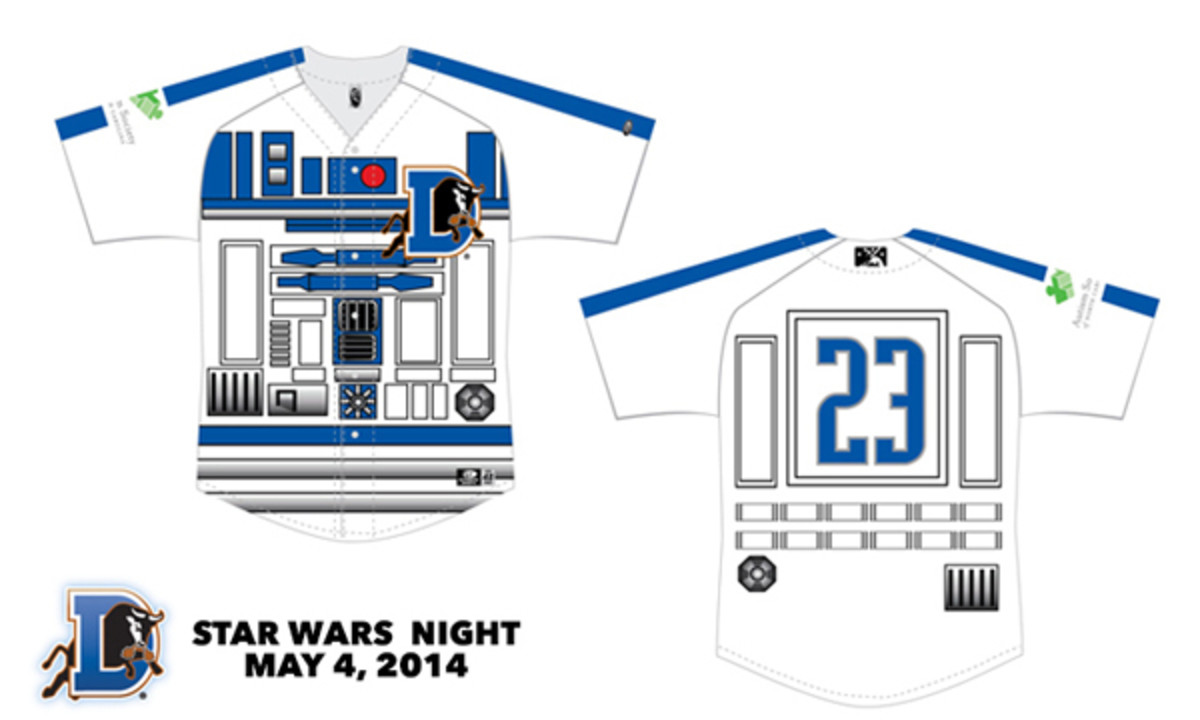 In past years, the team has invited characters like Darth Vader and Chewbacca to the park and worn special outer-space-themed jerseys. But the droid duds they've got planned for this season are truly out of this world. And after the game, the uniforms will be auctioned off to benefit the Autism Society of North Carolina.