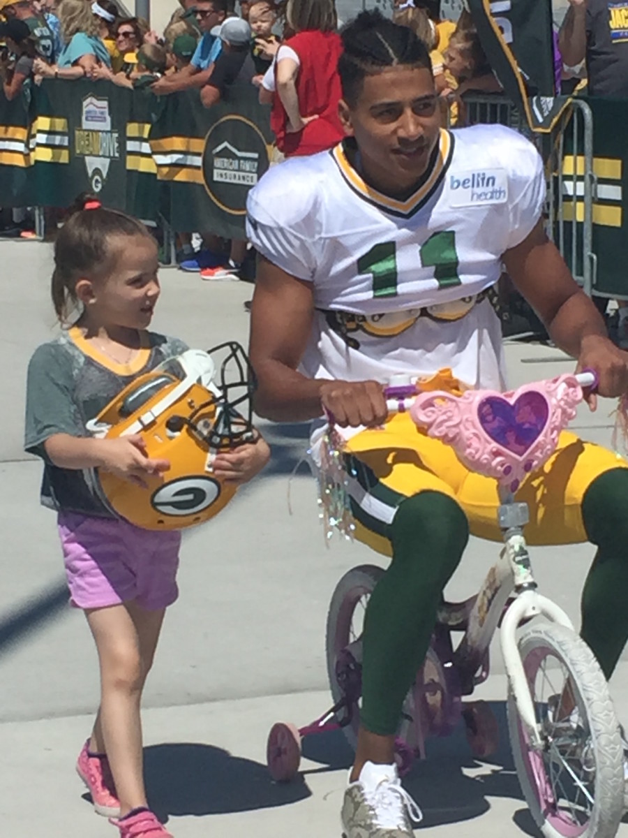 The Lambeau Leap has been shown on TV for almost 25 years, ever since LeRoy Butler combined the celebration of scoring a touchdown with showing fan appreciation on a cold Wisconsin day in 1993. However, few people outside of Wisconsin know about the almost 60-year-old tradition of Packers players riding kids’ bikes to practice throughout training camp. Often, the newest players don’t even know about this tradition until their first day of camp!