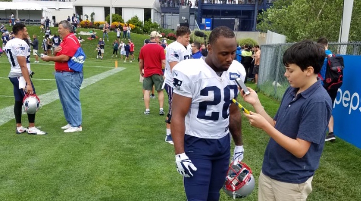 It’s the third day of Patriots training camp, and the two fields outside Gillette Stadium are packed with eager fans. Kids dive to catch Stephen Gostkowski field goals after they pass through the goalposts. Whistles blow every few seconds as the players get in formation to start each play. Machines that hurl the ball into the air make satisfying “thwack” noises. From up close, the noise of pads clashing is coming through loud and clear. On this rainy New England morning, James White is just another player practicing for the upcoming season. After camp ends for the day, he takes some time to talk about his career and the game this past February that made him famous.