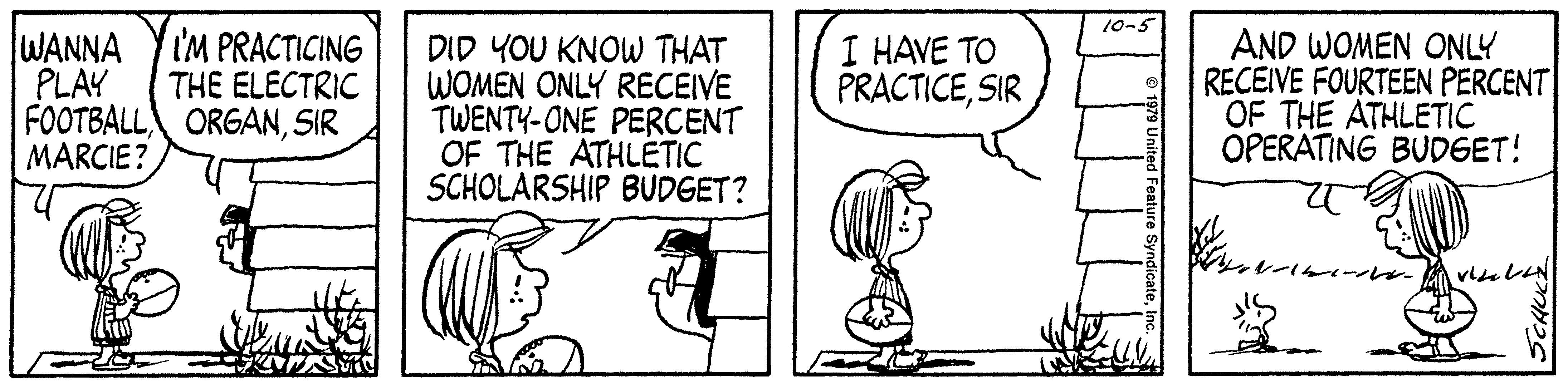It was in this political climate that Charles Schulz decided to enter the fray. A few years after Title IX was signed into law, Peppermint Patty’s sense of injustice fueled a vigorous Peanuts defense of Title IX.