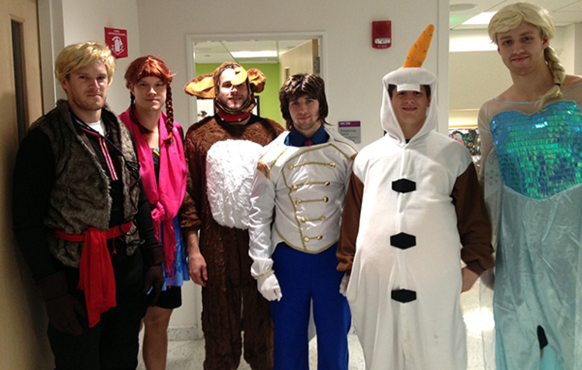 That’s them at the top of the page: Miller as Kristoff, Fraser as Anna, Bartkowski as Sven, Griffith as Hans, Krug as Olaf, and Hamilton as Elsa. They seem to be having a good time, but maybe they’re a little embarrassed to have to wear those outfits? Nope, said Hamilton. “I think it’s fun, whatever can make them smile,” he added. “It’s all about fun for them, so no shame at all.”