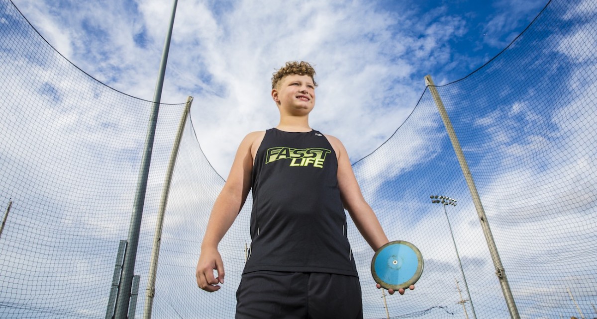 He came into his own, but in different sports. He was on the offensive line in football, and he loved it. (He’s played in three All-America games.) He began wrestling, and soon he was placing at out-of-state tournaments. He first went to nationals in the shot put when he was seven. One year ago, he took up discus, and in July he won the 11–12-year-old event at the USATF Junior Olympics (33.27 meters). His parents, William and Aileen, both threw in college, and they coach their 12-year-old son in his field events. “He’s driven,” William says. “A lot of it just comes naturally from within. He’s going to figure out a way.”