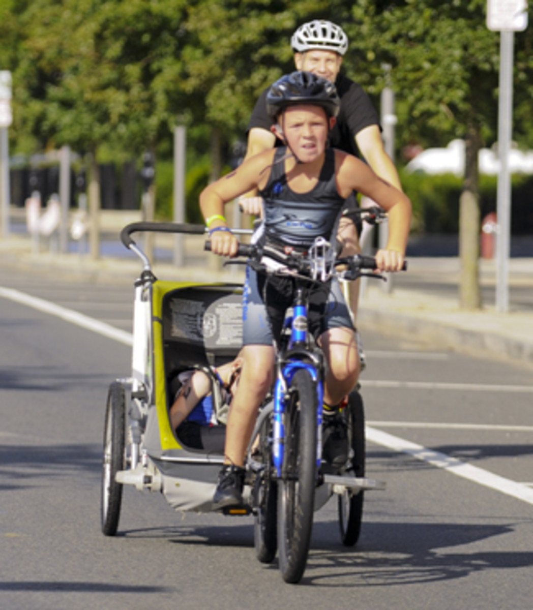 That first race together, in June 2011, started with 100 yards of swimming. (The swimming leg was Cayden’s favorite, as he laughed and smiled the whole way.) Gildersleeve carried Cayden out of the raft and to the trailer for the hilly three-mile biking leg of the race. In this race, Conner would bike alone while Gildersleeve rode alongside him with Cayden hitched to her bike. Conner didn’t like that arrangement one bit. The whole ride he kept telling Gildersleeve to let Cayden ride with him. Finally, after they cleared one last large hill, Cayden’s trailer was hitched to Conner’s bike. “And he just took off,” Gildersleeve remembers.